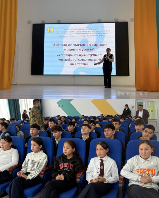 Ақмола облысы мәдениет басқармасының «Тарихи-мәдени мұраны қорғау және пайдалану орталығы» КММ-сі Көкшетау қаласының №9 жалпы білім беретін мектебінің оқушыларына «Ақмола облысының тарихи-мәдени мұрасы» атты тарих сабағын өткізді. Сабақ барысында Ақмола облысының ескерткіштері туралы мәліметтер ұсынылды. Сабақтың негізгі мақсаты - оқушыларды туған өлкенің бай мәдени мұрасы туралы білімдерін кеңейту, отансүйгіштік және Қазақстанның тарихи мұрасына құрмет сезімін дамыту, сондай-ақ жастардың өз халқының дәстүрлері мен құндылықтарымен байланысын нығайту болып саналады.