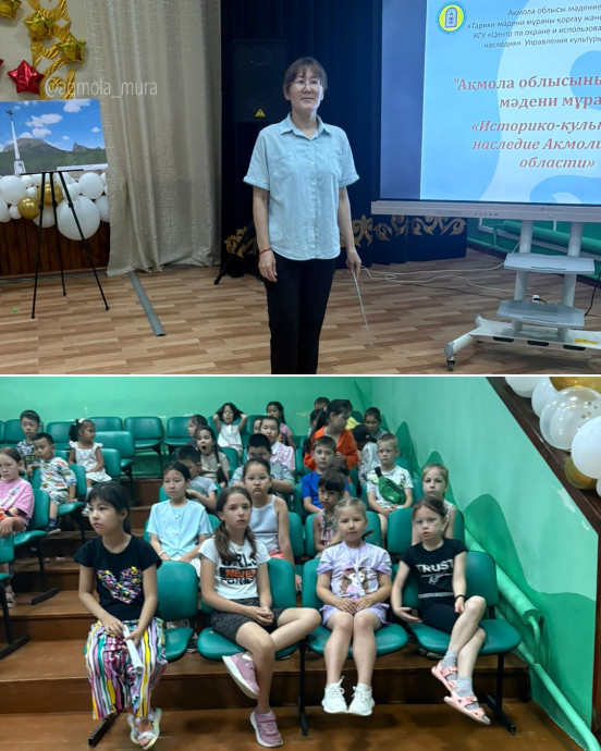 КГУ «Центр по охране и использованию историко-культурного наследия» управления культуры Акмолинской области провел урок истории по теме «Көкшетау қаласының тарихи-мәдени мұра ескерткіштері» в летнем оздоровительном лагере для 1-4 класов школы-лицей №21 г. Кокшетау. В ходе занятия были представлены сведения о памятниках г. Кокшетау. Основной целью урока было расширение знаний учащихся о богатом культурном наследии родного края, развитие патриотизма и уважения к историческому наследию Казахстана, а также укрепление связи молодежи с традициями и ценностями своего народа.