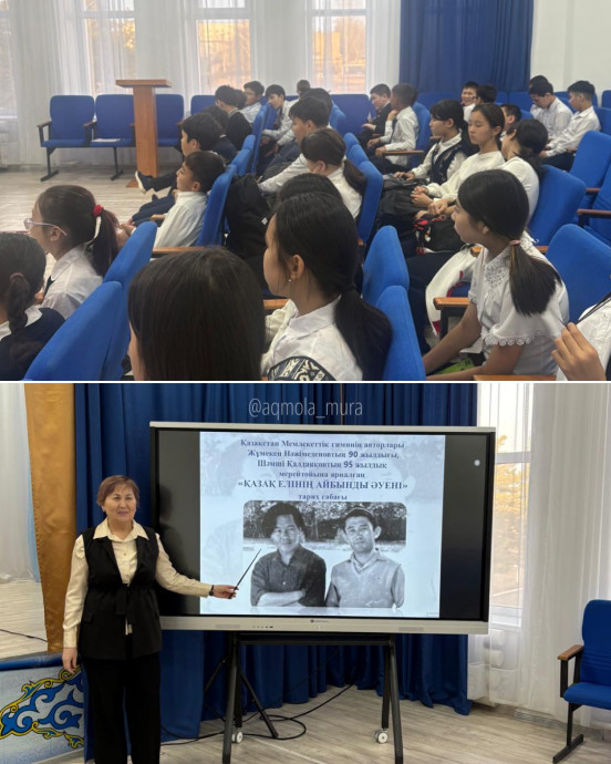 КГУ «Центр по охране и использованию историко-культурного наследия» управления культуры Акмолинской области провел урок истории «Қазақ елінің айбынды әуені», посвященный 90-летию авторов Государственного гимна Республики Казахстан Жумекена Нажимеденова и 95-летию Шамши Калдаякова для учащихся средней школы № 7 пос.Станционный города Кокшетау.