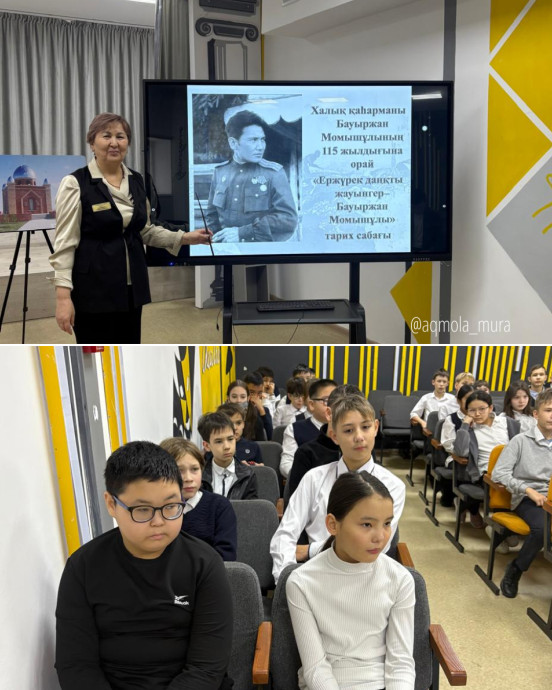 На занятии учащиеся познакомились с боевым путём Бауыржана Момышулы, его вкладом в защиту Родины в годы Великой Отечественной войны, а также с его литературным наследием, раскрывающим морально-нравственные ценности, мужество и преданность своему народу.